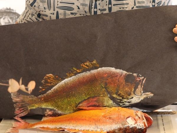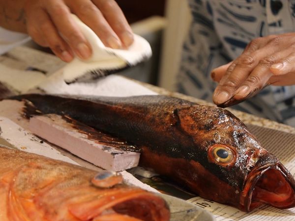 ”Gyo” is translated to ”fish” and “Taku” = “impression”. Traditionally it is a process of grinding down jet black pine soot into fine powder and mixing it with water to create a special, non-toxic ink. The artist applies this ink directly onto a freshly caught fish and lays a piece of thin rice paper over it and begins to rub an impression of the fish onto the paper- creating a one of a kind masterpiece.